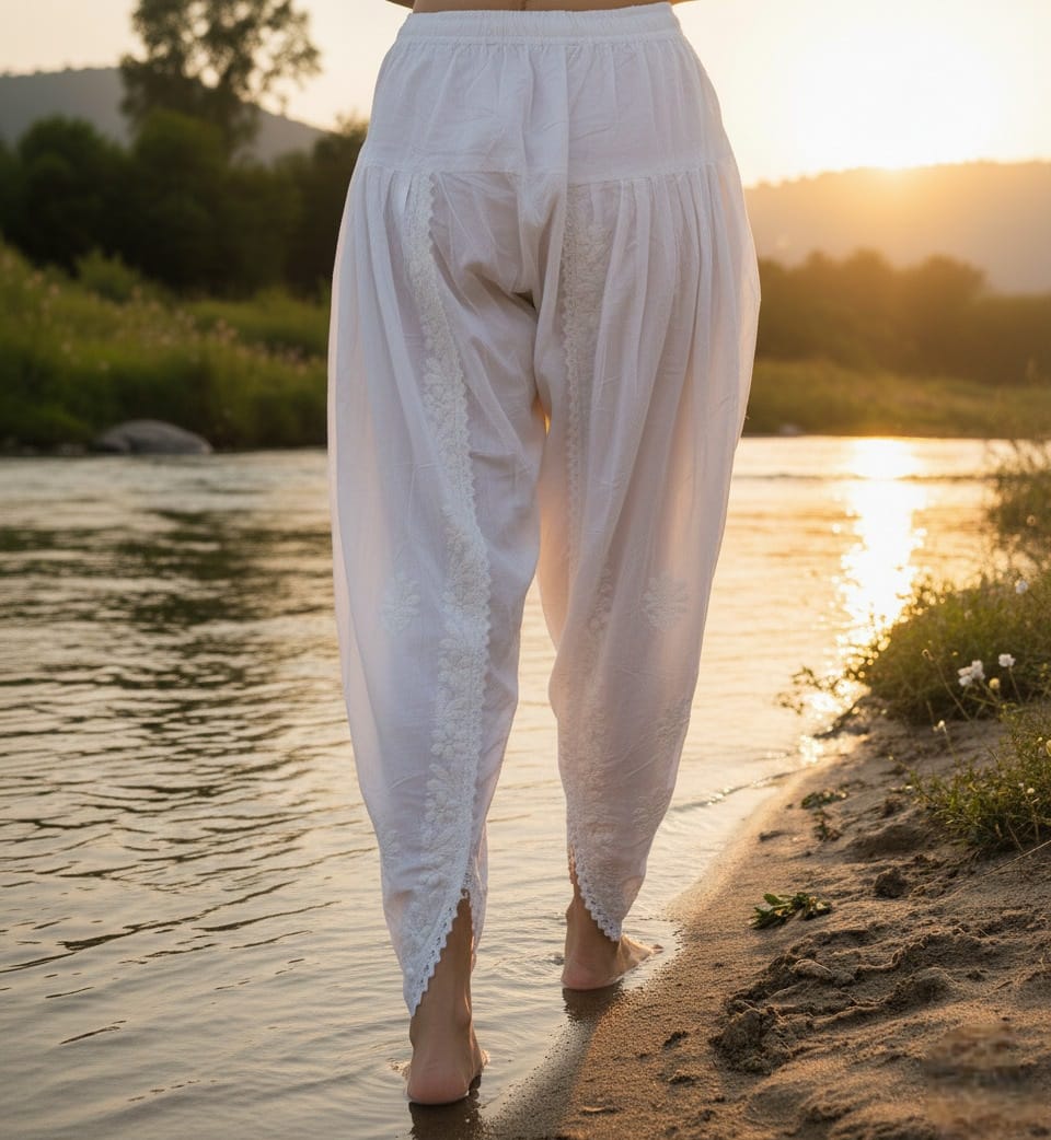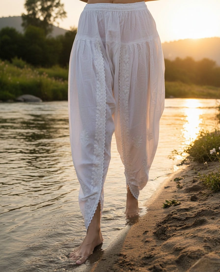 APs Cotton Chikankari Dhoti is a traditional Indian ethnic garment made from lightweight, luxurious Cotton fabric and featuring delicate hand-embroidered Chikankari, a style originating from Lucknow, Uttar Pradesh. These Dhotis are known for their extremely soft feel, intricate motifs, and a subtle elegance.